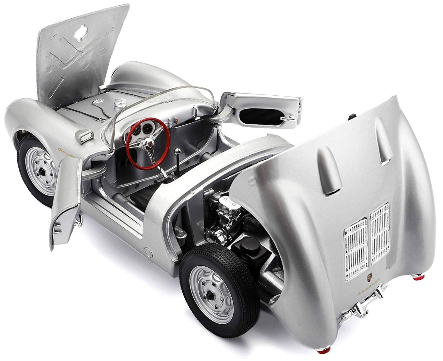 A 1/18 scale die cast model of the 1956 Porsche 550A Spyder. Features opening parts and steerable wheels with highly detailed interior and exterior. Body is die cast metal and plastic parts.